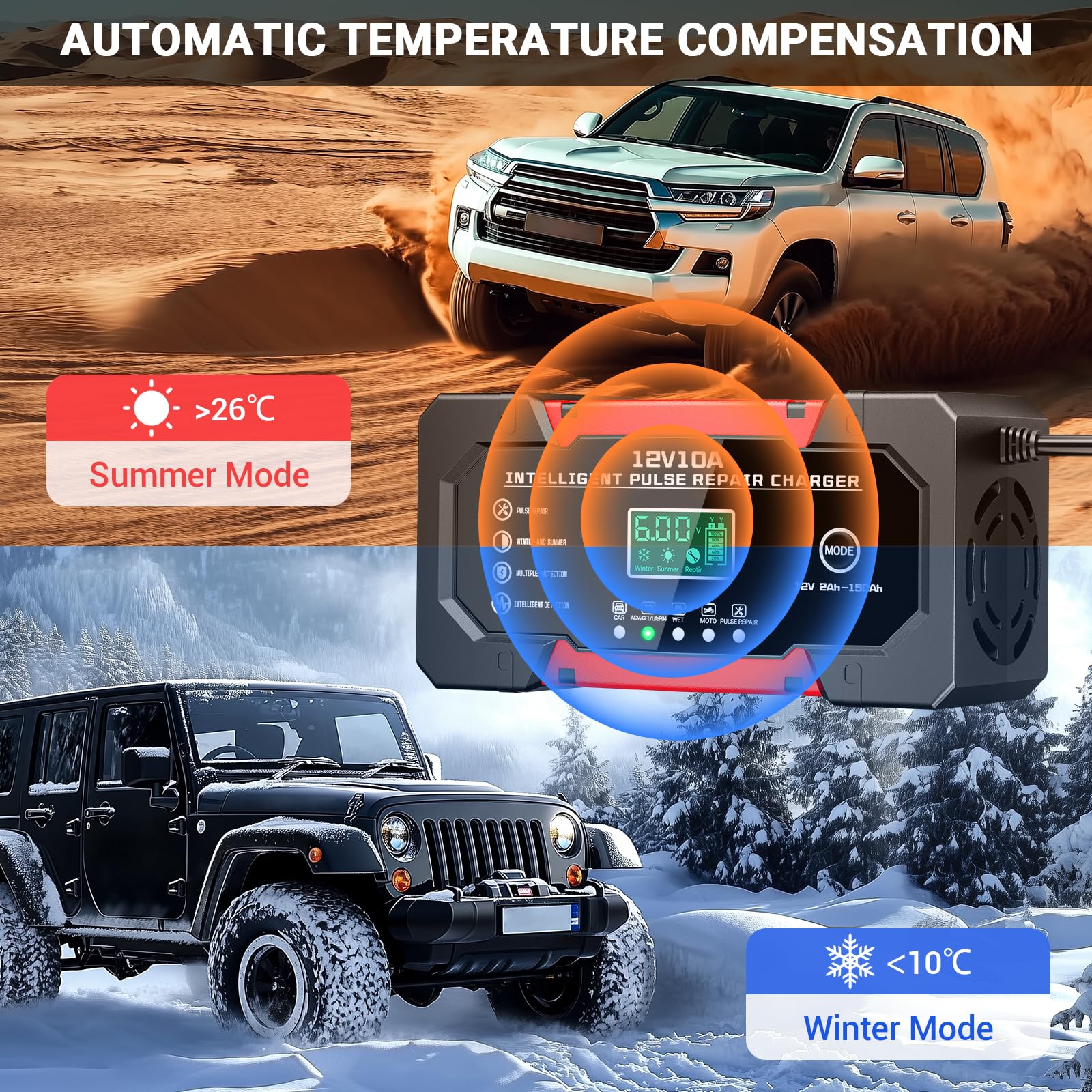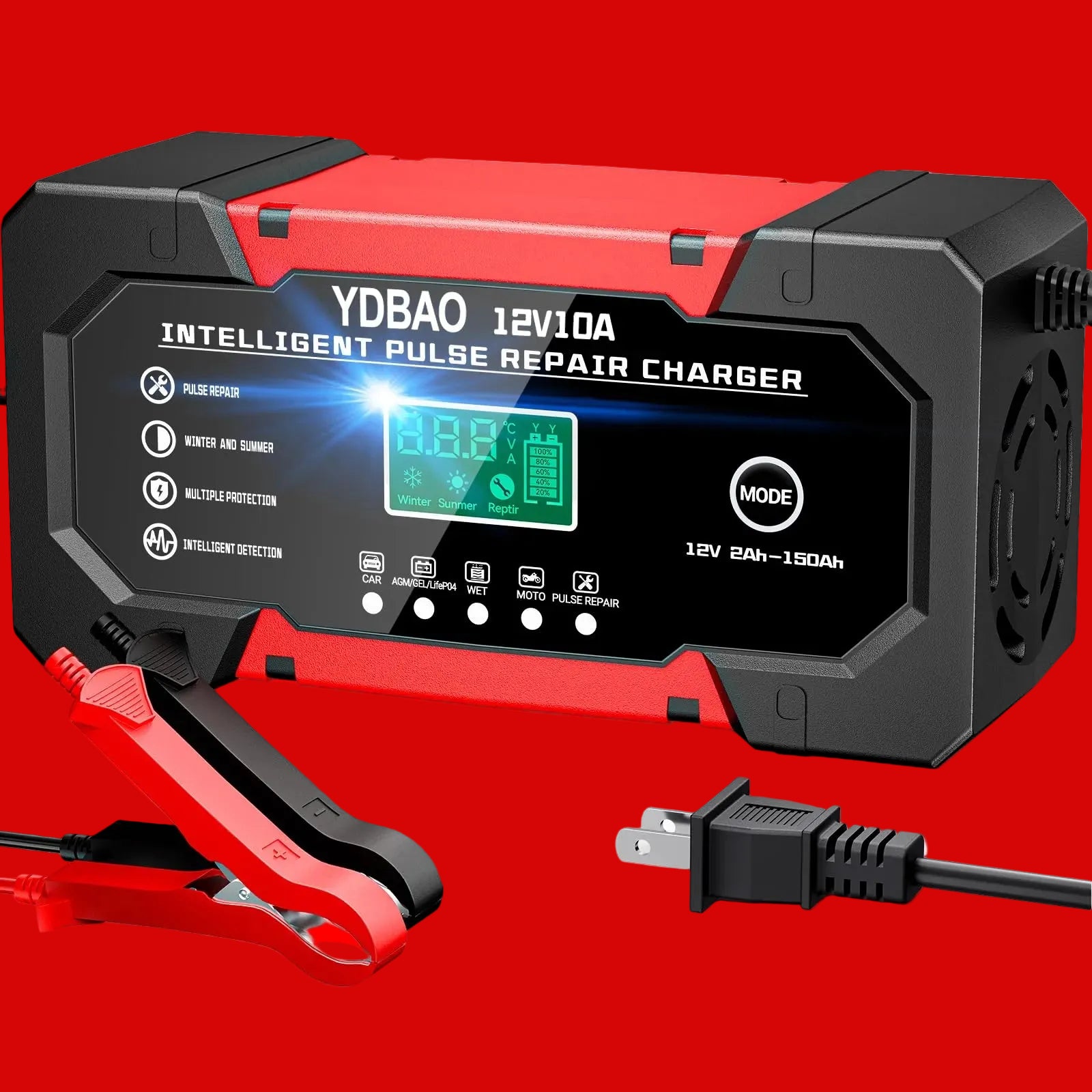 - 3 in 1 Battery Charger: Our 10A car battery charger comes with a compact size and 10A 12V super fast charging, compatible with all 12V lead-acid batteries (including AGM, GEL, SLA, VRLA, extending their life and functionality.